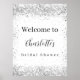Un panneau de bienvenue pour une fête de fiançailles. Un fond blanc élégant décoré de fausses paillettes d'argent scintillantes. Personnalisez et ajoutez un nom. Lettres noires.