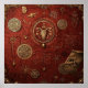 An ornate emblem glows in gold against a textured crimson backdrop, surrounded by arcane symbols and cryptic inscriptions.