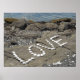 Un beau cadre sur l'océan. Le mot amour épelé à l'aide de coquillages blancs rassemblés à la plage.