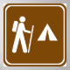 Signal routier et routier de style international pour conseiller les installations récréatives, plus précisément : sentier randonnée avec camping.