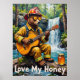 Cette charmante oeuvre présente un ours habillé comme pompier, avec casque et lunettes de soleil, jouant d'une guitare acoustique assis sur une bille tombée à côté d'une belle cascade. Un pot de miel se trouve à proximité. L'arrière - plan présente une végétation luxuriante et l'eau en cascade qui s'écoule dans un ruisseau clair. Le tableau utilise des coups de pinceau épais et texturés, donnant une sensation de fantaisie et de coeur, avec "Love My Honey" écrit ci-dessous.