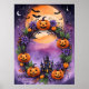 Ajoutez une touche de magie à votre décor d'Halloween avec cette affiche vibrante qui présente une couronne lunaire composée de lanternes jack-o’, de fleurs violettes et de feuilles d'automne. Sur fond de pleine lune avec des chauves-souris qui volent à travers, et de silhouette éffrayante du château, cette oeuvre reflète l'esprit festif de la saison. Parfait pour apporter une atmosphère éffrayante et enchanteresse dans n'importe quel espace.
