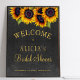 Elégante douche nuptiale d'automne élégant panneau d'accueil modèle sur tableau noir gris foncé avec un beau bouquet de tournesols. Facile à personnaliser avec vos détails. Vous pouvez choisir de le customiser en changeant encore les polices et les couleurs du lettrage.++++++++ Il convient pour les élégantes fêtes wedding showers de jardin rustique été ou automne.