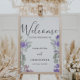 Signalisation de mariage moderne et élégant avec écriture manuscrite noire simple et élégante sur un arrière - plan blanc avec ajout de fleurs violettes et d'eucalyptus vert sauge. Customisez avec vos détails uniques.