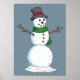 Un bonhomme de neige à l'allure joyeuse mais froide porte un chapeau haut à ruban rouge et une écharpe verte sur cette illustration hivernale de Richard H. Fay.