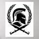 Silhouette of spartan helmet and shoulders with two crossed swords and wreath surrounding helmet.