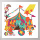 Nos vêtements et cadeaux Circus Performers présentent un design lumineux et amusant avec une grande tente haut, un ours et un vélo, un éléphant équilibrant sur une balle, un clown de chien avec des ballons, et des trapézistes
