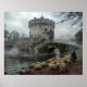 A medieval castle tower stands by a misty riverside, with a shepherd overseeing a flock of sheep grazing along the bank. The scene is serene, with the foggy backdrop adding a mysterious atmosphere.