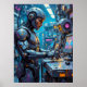 Ce tableau représente une cyborg femelle qui exploite un poste de travail complexe dans un cadre futuriste. Son corps et son casque sont un mélange de gris métallique et de blanc, accentué de lumières orange brillantes. L'arrière - plan est un réseau dense et complexe de machines et de moniteurs, tous rendus avec un style d'impasto épais et texturé. La palette de couleurs blues et oranges de l'oeuvre crée une atmosphère dynamique et technologiquement avancée.