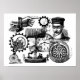 Steampunk inspiré design graphique noir et blanc. Comprend de nombreux articles à vapeur victoriens de l'âge de vapeur d'un ballon moteur à vapeur, vélo de promenade, homme de galerie, boussole, montre visage ou horloge, main, machine à écrire, ampoule et des engrenages. Idéal pour tous ceux qui aiment le steampunk, le design, l'ingénierie ou la mécanique.