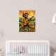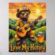 Cette oeuvre d'art vibrante présente un ours habillé comme pompier, avec casque et lunettes de soleil, jouant d'une guitare acoustique, assis parmi des fleurs sauvages sur une colline herbacée surplombant une vallée pittoresque. Un pot de miel se trouve à proximité. Le soleil se couche dans l'arrière - plan, projetant une chaude lueur dorée sur les collines verdoyantes et les arbres éparpillés. Le tableau utilise des coups de pinceau épais et texturés, donnant une sensation de fantaisie et de coeur, avec "Love My Honey" écrit ci-dessous.