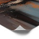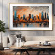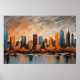 Cette affiche présente une peinture acrylique abstraite qui capture magnifiquement un paysage urbain au coucher du soleil. Le paysage urbain est composé de bâtiments audacieux de forme géométrique qui se dressent sur le fond d'un ciel spectaculaire. Les bâtiments, dans les tons bleus, gris et noirs, apportent une touche de profondeur et de dimension à la scène. Le front de mer, parsemé d'arbres, ajoute une touche de nature au paysage urbain. Les arbres, à l'ombre d'une orange vif, donnent un indice à la saison de l'automne. Les bâtiments et les arbres projettent leurs réflexions sur l'eau, créant un effet miroir qui améliore l'attrait visuel général du tableau. Le ciel est un spectacle en lui-même, avec un mélange spectaculaire de gris, d'orange, de blanc et de bleu. Les couleurs du ciel semblent changer avec le soleil couchant, ajoutant un sentiment de dynamisme à la scène. Le thème des couleurs de la ligne d'horizon complète les couleurs du ciel et du bord de mer, créant une expérience visuelle harmonieuse. Cette affiche d'art moderne, avec sa représentation abstraite d'une ville au coucher du soleil, ne manquera pas de séduire les spectateurs avec ses couleurs audacieuses, son imagerie dramatique et son flair artistique. Elle témoigne de la beauté des paysages urbains et des saisons changeantes. Que vous soyez un amateur d’art ou simplement quelqu’un qui apprécie les belles scènes, cette affiche est un atout pour votre maison.