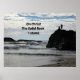 Vue pittoresque sur la côte rocheuse du Pacifique, avec des silhouettes de gens debout sur un rocher, avec des vagues qui s'écrasent tout autour. Le message dit : "Sur Christ le Rocher Solide je suis debout."