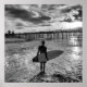 Image en noir et blanc d'un surfeur tenant une planche de surf près de Oceanside Pier dans le sud de la Californie, États-Unis.