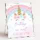 Ce joli panneau sera un grand ajout à votre fête. Ce design présente un visage de licorne avec un arc-en-ciel aux couleurs pastel et des ornements de parties scintillant en faux or.
