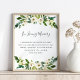 Conçu pour correspondre à notre collection de mariages floraux d'Albâtre, cet élégant panneau botanique est parfait pour placer à une table commémorative ou présenter en l'honneur des êtres chers qui sont passés. Personnalisez l'en-tête et le texte du corps (illustré par "In Loving Memory" et un bref poème) encadrés par une verdure d'aquarelle luxuriante et des fleurs blanches.
