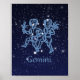 Imprimé avec le symbole de Gemini en bleu argenté doux, recouvert des étoiles de la constellation, contre un arrière - plan étoilé en bleu nuit profond à noir.