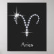 L'impression d'affiche de glamour scintillante présente le symbole zodiaque / astrologique pour Aries en strass (faux) diamant avec texte blanc sur arrière - plan noir.