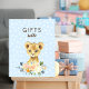 C'est un panneau de table Cadeaux pour le baby shower. Le design est un adorable lionceau aux fleurs d'aquarelle avec un arrière - plan bleu bébé aux points blancs doux.