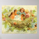 Dans l’illustration vintage d’un livre pour enfants, un garçon et une fille font une fête de thé avec trois robins dans leur nid et divers elfes et fées.