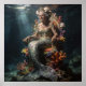 An elderly mermaid sits regally on a coral throne under the sea. Light filters down, illuminating the detailed scales and sea vegetation.
