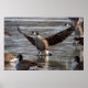 A group of Canadian geese are gathered on a partially frozen lake, with one prominently displaying its wings in the center. The geese are surrounded by a reflective icy surface, creating a wintry scene.