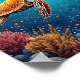 Sea Turtle Underwater - Une scène sous-marine vibrante présente une grande tortue de mer nageant gracieusement à travers un océan turquoise et bleu. La carapace de la tortue est une belle orange et marron, avec des motifs complexes. La lumière du soleil coule du dessus, créant un effet chatoyant dans l'eau. De petits poissons jaunes nagent autour de la tortue, ajoutant à l'ambiance animée