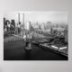 Manhattan Bridge, New York. Sur East River à Flatbush Avenue, avec des tours du World Trade Center en arrière - plan. Ce pont suspendu à une seule travée contient l'une des plus longues travées de suspension aux États-Unis, et avait la plus grande capacité de transport au pays au moment de sa construction. Il est inhabituel en ce qu'il a été conçu comme un pont à deux niveaux; transportant des voitures de rue au niveau supérieur et des voies de métro au niveau inférieur, avec des routes au centre de chaque niveau. Les abords du pont ont été conçus par Carrere et Hastings, et incorporent des figures allégoriques de Manhattan et Brooklyn par Daniel Chester French, qui ont été enlevés depuis au Brooklyn Museum.