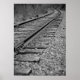 Photographie en noir et blanc d'une voie ferroviaire rustique courbant autour du virage