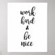 Une impression minimaliste de typographie motivationnelle qui dit Word Hard et Be Nice dans un design de citation noir et blanc. Parfait pour la décoration d'un bureau ou d'une cabine.