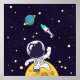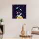 Une affiche avec un arrière - plan bleu foncé aux étoiles jaunes parsemée. Couché sur le dessus est l'illustration d'un astronaute vêtu d'une combinaison blanche flottant au-dessus de la lune. Au loin se trouve une planète avec des anneaux et un vaisseau-fusée qui s'envole dans le ciel à la recherche de nouveaux mondes à explorer.