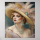 Une élégance juive Ce portrait est un hommage captivant à l'époque Art Déco, avec une femme d'une beauté à couper le souffle. Ses traits sculptés sont accentués par les teintes douces et fumantes de son maquillage et le rouge riche de ses lèvres parfaitement confectionnées. Elle porte une casquette opulente ornée de plumes pastel qui cascade comme une douce cascade, ajoutant une touche de dramatique raffinée à son calme. La casquette, associée à la somptueuse bijouterie aqua qui lui fait grincer le cou et les oreilles, rayonne du luxe et du style qui caractérisaient les années folles. Son comportement est d'une tranquillité de confiance et d'allure, caractéristique de l'élégance intemporelle des fissures.