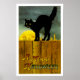 Illustration d'Halloween vintage montrant un chat noir sur une clôture avec une face de lune derrière.