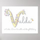Poster de nom d'art en monogramme V, parfait pour une chambre ou une salle de jeux pour filles dans les tons gris, blanc, jaune, rose et violet. Personnalisez avec le nom de votre enfant commençant par V, et le nom signifiant une touche vraiment personnalisée à la chambre ou à la crèche de votre enfant, cet exemple est pour le nom V Valda A règle. Vers la terre et la parole droite. Mignonne affiche idéale pour un nouveau bébé, un baptême ou un cadeau de baby shower. © Unique V monogramme coeurs et fleurs dessin description et graphisme design par Sarah Trett. www.sarahtrett.com pour www.mylittleeden.com