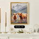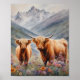 Cette affiche est une peinture de deux vaches des montagnes dans un paysage naturel. Les vaches ont une longue fourrure et des cornes, et elles sont entourées de fleurs colorées. L'arrière - plan montre une chaîne de montagnes avec de la neige et de la brume. L'affiche a une palette de couleurs douce et sereine. 🎨