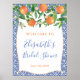 Aquarelle oranges et jolies fleurs sur fond de motif de carreaux bleus cobalt et blancs pour ce panneau de bienvenue de douche de mariage ou de bébé élégant.