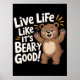 Cette illustration joyeuse présente un ours souriant avec ses bras levés, exsudant joie et positivité. Le texte "Vivre la vie comme c'est Bear-y Good !" entoure l'ours, créant un thème stimulant et motivant. Le design dynamique capture une humeur légère et joyeuse, parfaite pour diffuser positivité et encouragement.