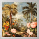 Lush tropical scene showcasing a variety of palm trees and colorful flowers. The setting evokes a sense of tranquility and natural beauty.
