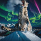 « Errant du ciel du Nord » - Portrait de léopard des neiges. Sur un ciel strié d'aurores boréales dansantes, un léopard des neiges est assis, calme et maître, au sommet d'une cime gelée. Bien qu'il appartienne aux montagnes du sud, il devient ici un voyageur surnaturel, étrangement chez lui dans la nuit scintillante. L'air vif, les étoiles brillantes et les lumières lointaines des villages se fondent en un tableau enchanteur de sauvagerie et de mystère.