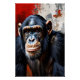 Un portrait captivant d'un chimpanzé ! Une fourrure détaillée, des yeux expressifs et un arrière - plan rouge et neutre contrasté captent la force et l'émotion de ce primate. Art qui célèbre la beauté sauvage avec une touche humaine, invitant à la connexion à la nature.