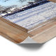 Cette belle scène enneigée montre un parc en hiver. La neige longe les branches des arbres et s'étend au fond du sol. Le ciel est bleu et le parc a été transformé en terre des merveilles hivernales. La vue est encadrée par un cadre de fenêtre en bois, créant l'effet d'une fausse fenêtre que l'on aperçoit au-delà du parc enneigé.