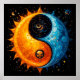 Représentation artistique d'un symbole yin-yang avec des motifs de soleil et de lune vives, symbolisant l'harmonie et la dualité.