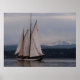 Mt. Baker a vu à la distance as the Zodiac sailing ship is becalmed on the still waters of Bellingham Bay.