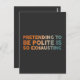 Zeigen Sie Ihre humorvolle Seite mit diesem witzigen Abschlag, perfekt für diejenigen, die vorgeben, höflich anstrengend zu sein. Ideal für Introvertierte und alle, die Ehrlichkeit schätzen, dieses Shirt erfasst den Kampf der sozialen Nettigkeiten. Tragen Sie es stolz und lass jedem weiß, dass es bei Ihnen um den behalt geht