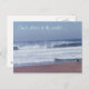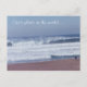 Eine Einzelfigur ist am Rand der Wellen in der unteren rechten Ecke stehend. Am Strand stürzen große Wellen vom Pazifischen Ozean. Der Horizont ist leer. Im Text steht: "Man hat Platz in der Welt ..." (kann personalisiert/verändert werden).