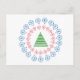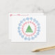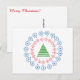 Ein stilisierter grüner Baum sitzt in der Mitte des Kreises von kleinen roten Ornamenten, in einem Kreis von mittelgroßen blauen Ornamenten. "Frohe Weihnachten!" Text in roter Schrift auf der Nachrichtenseite der Karte kann bearbeitet/entfernt werden.