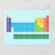 Postkarte mit Periodensystem der Elemente, wobei jede Elementgruppe in Regenbogenfarben markiert ist.