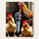 This photorealistic image captures a unique and humorous moment: a group of chickens with a professional microphone and audio recorder placed nearby, as if ready to cluck their thoughts. The scene blends rustic farm life with modern recording gear, creating a visually striking and playful composition. Perfect for content creators, farm lovers, or anyone with a love for quirky, high-detail visuals that tell a story.