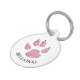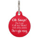Empreinte de patte à paillettes roses avec le nom du chien sur le devant sur fond blanc, au dos fond d'alerte rouge avec texte blanc qui dit OH Snap ! Je suis perdu - Appelle ma mère, elle pleure laidement. Le fond rouge attire l'attention sur le médaillon pour que la personne qui trouve le chien voie l'alerte.