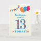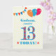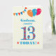 Carte d'anniversaire colorée pour un filon de 13 ans, Le grand numéro 13 est rempli d'un motif orange, rouge et bleu, surligné de bleu vif. Il y a des ballons et du bunting en haut, dans des couleurs assorties et l'accueil de couverture est : "Godson, vous avez 13 ans aujourd'hui !" en lettres rouge et bleu vif, sur un arrière - plan de pois jaune et blanc très pâle, avec des étoiles rouges et orange de chaque côté du mot "AUJOURD'HUI !". Le message intérieur peut être facilement customisé ou supprimé si vous le souhaitez.